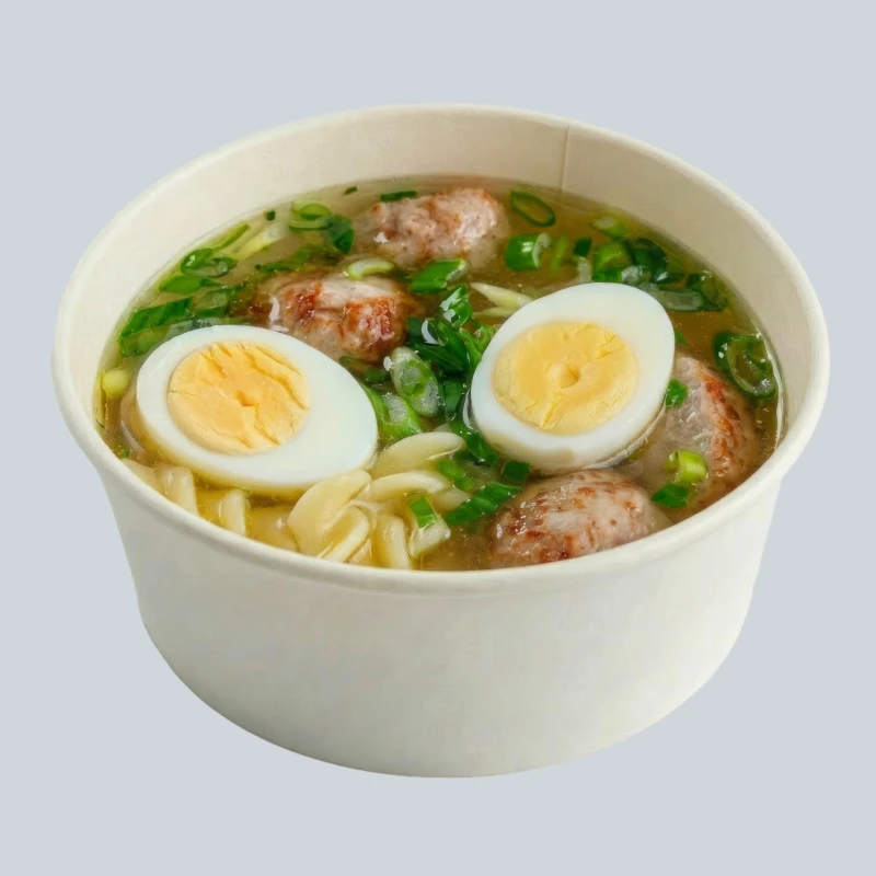 Бульон куриный, фрикадельки из индейки, спиральки, яйцо перепелиное, лучок зелёный